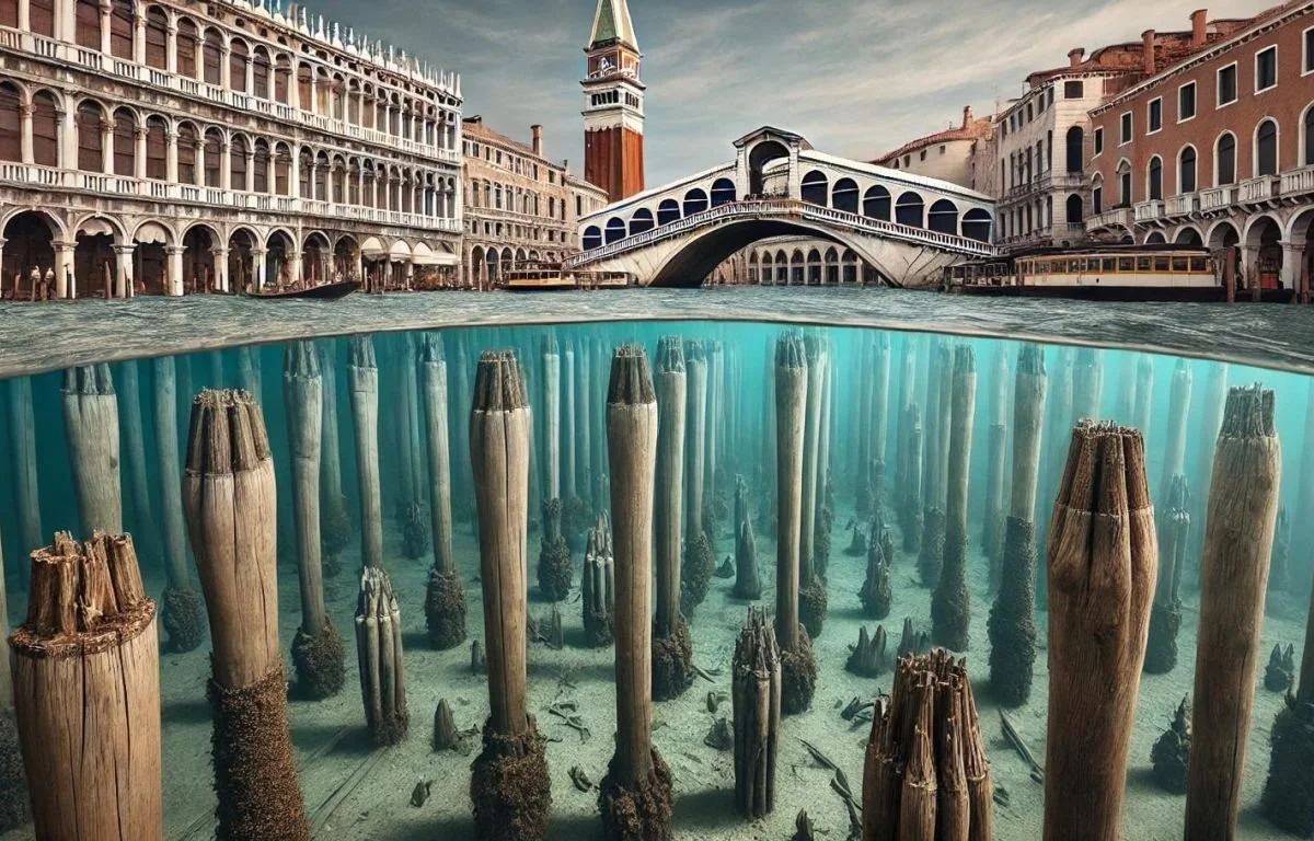 Ci sono tantissimi pali in legno fissati nel sedimento della laguna, sul fondale della laguna. Questi pali in legno sostengono la città e sono davvero tantissimi.